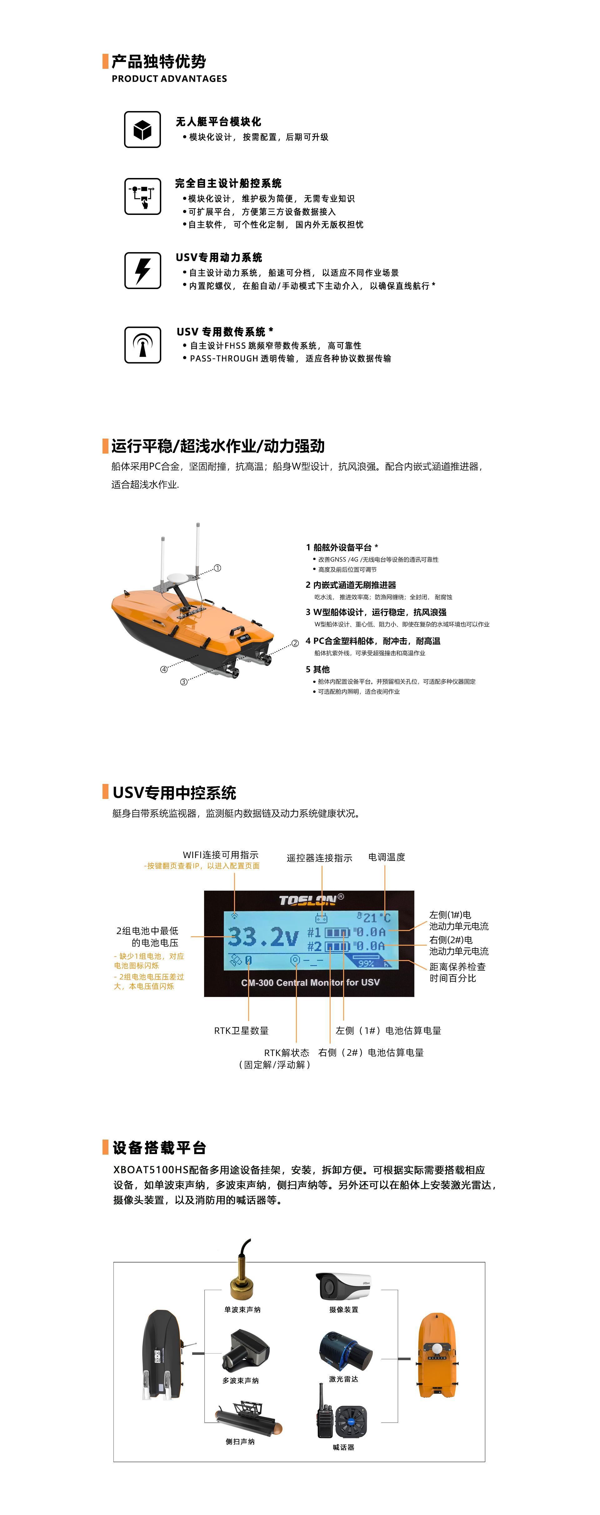 XBOAT5100HS配置舱内,舱外仪器平台和设备挂架。可搭载多种仪器和测量设备,如单波束测深仪、侧扫声呐、多波束声纳等。广泛应用于河流、湖泊、航道区域的水下地形地貌测量、水文水质测量、暗管普查等作业任务。